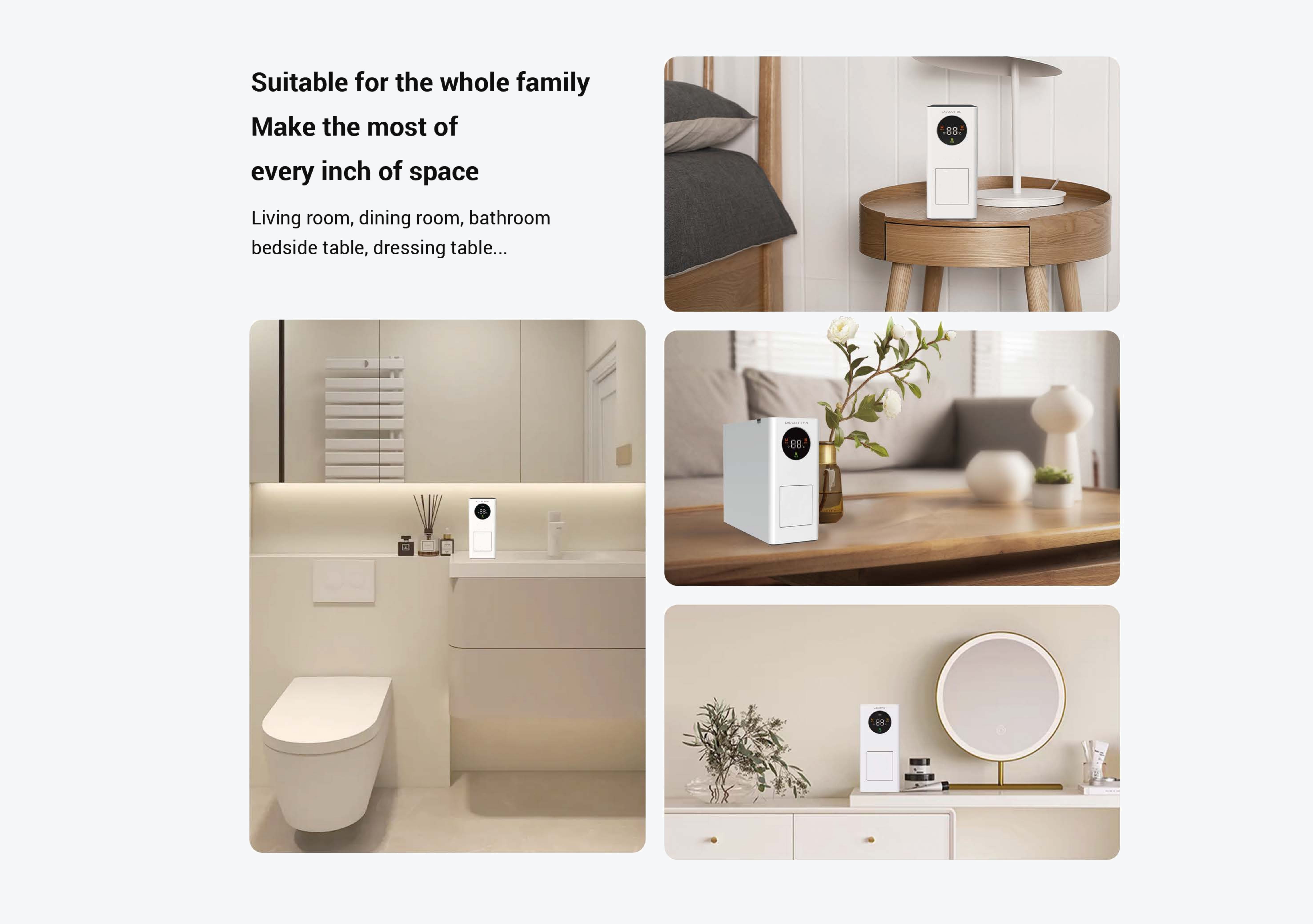 The W2J smart towel machine is suitable for all home scenarios, such as living rooms, dining areas, bathrooms, bedside tables, and dressing tables, providing a comfortable warm towel experience everywhere.
